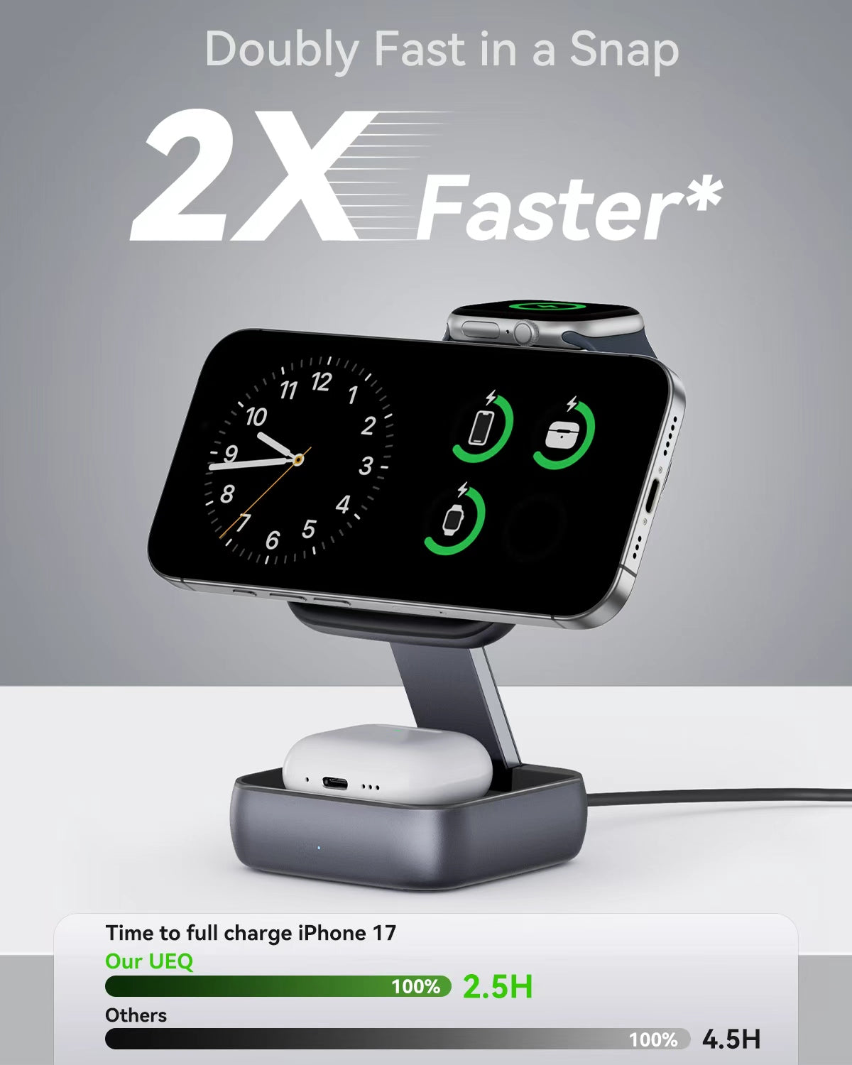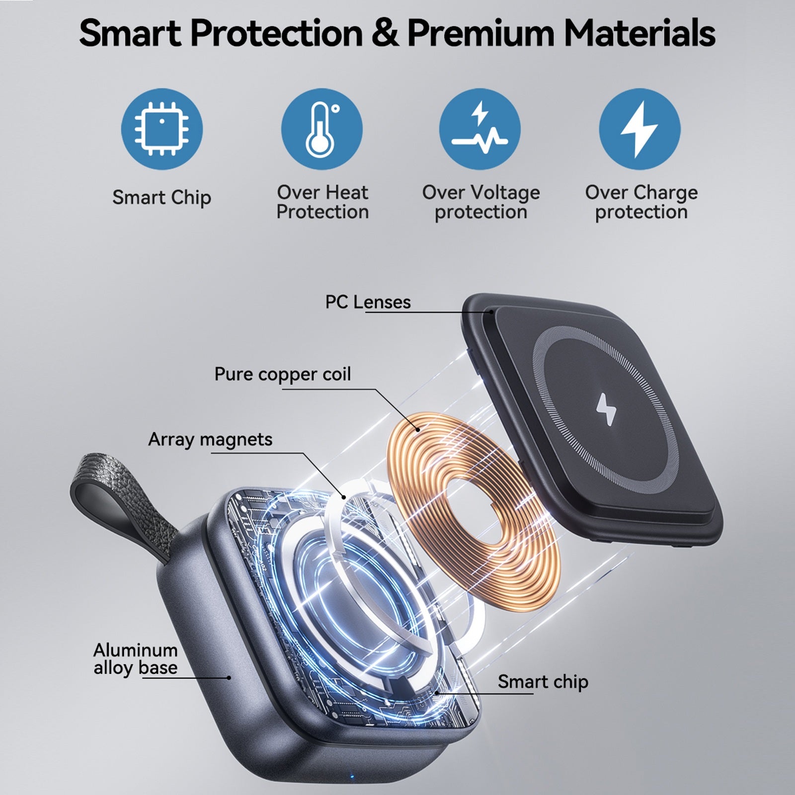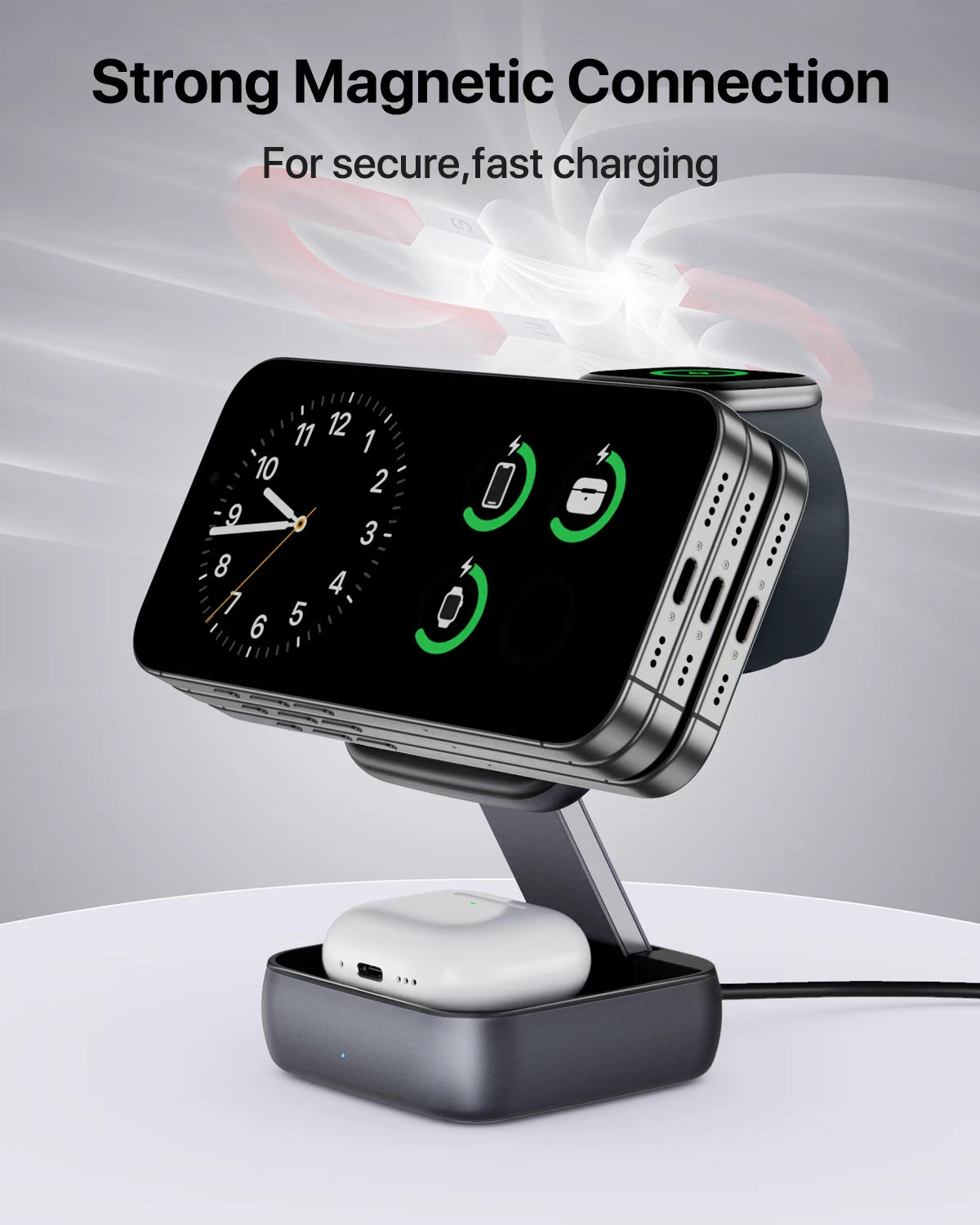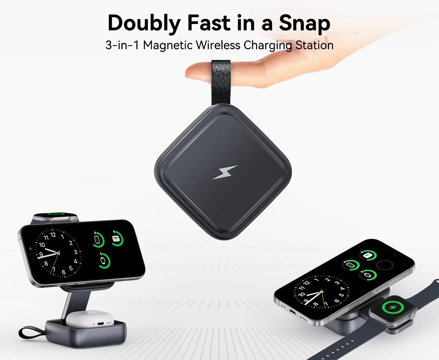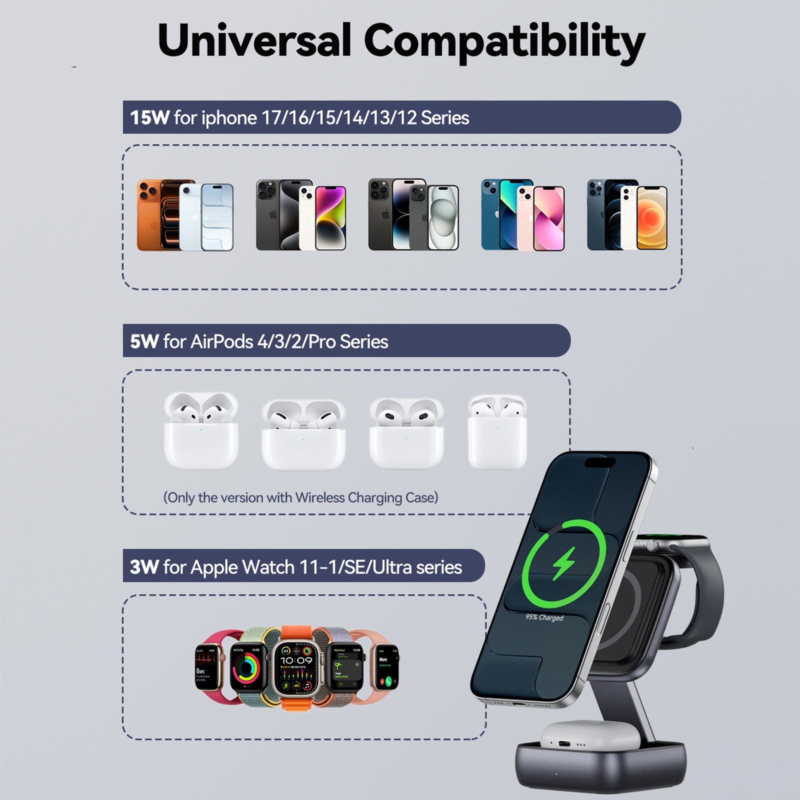 Compact 3-in-1 foldable MagSafe wireless charging station. 15W fast charging for iPhone 12–17, 5W for AirPods 2/3/4/Pro, 3W for Apple Watch 2–11/SE/Ultra. Strong magnetic alignment for secure hold. Foldable 180° stand supports StandBy mode. Smart overheat and overcharge protection. Aluminum alloy build with carry loop. Includes USB-C wall adapter and C-to-C cable. Travel-ready out of the box.